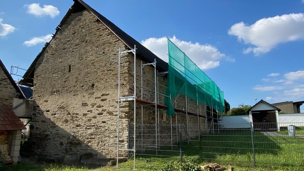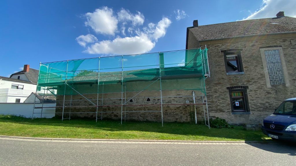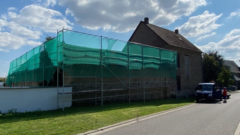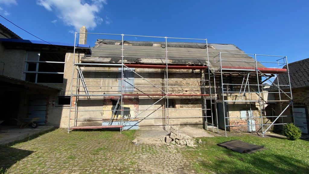 …das Gerüst wird heute gestellt, damit unser Zimmermann und Dachdecker das alte Dach abreissen kann. Wir sind so froh, dass es endlich (!) mit den Abriss- und Neubauarbeiten losgehen kann. Drückt uns mal ganz feste die Däumchen, damit nun mal alles wie am Schnürchen weitergeht.
