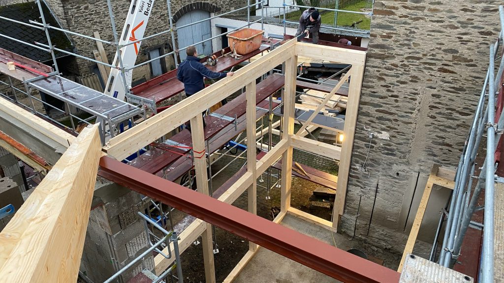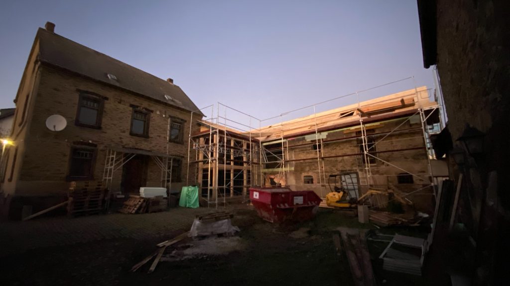 Heute wurde das Tagesziel erreicht. Schlafempore, Wintergarten, Fensterrahmen im Bad, Firstbalken und einen Teil der Sparren können wir am Abend bewundern. Ich stelle fest, dass unser Hof ein ganz und gar neues Gesicht bekommt.