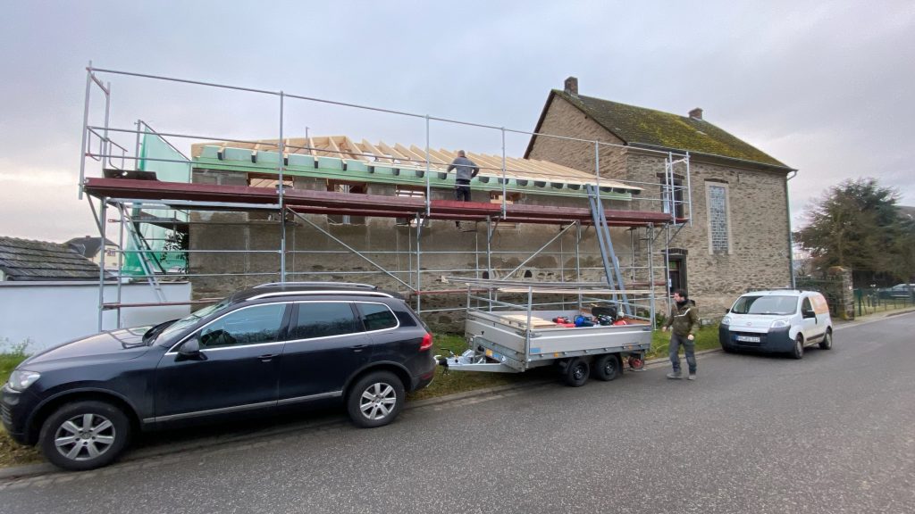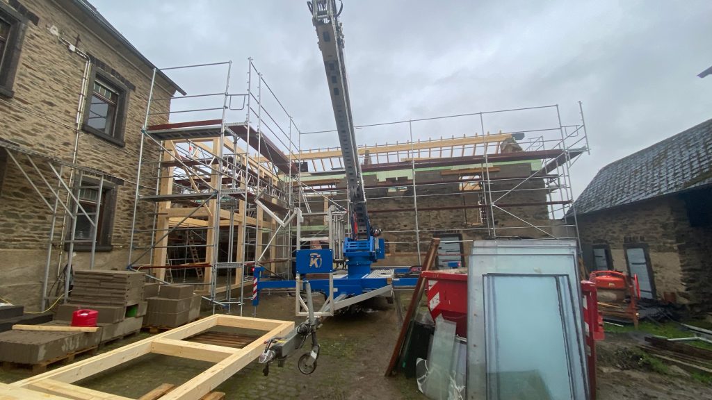 Heute werden die Sparren gezimmert und der Dachstuhl wird heute fertig. Wir haben Glück und das Wetter spielt mit. Gestern wurde es kurz mal windig und ein Balken begann am Kranhaken zu rotieren, was nicht ganz ungefährlich ist, aber “et hät noch jot jejange“