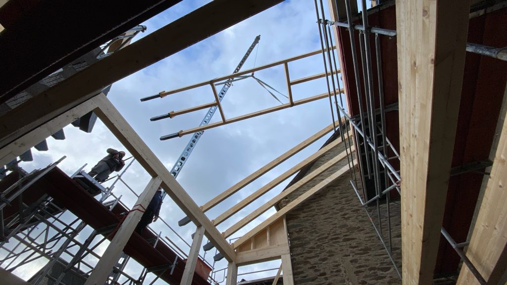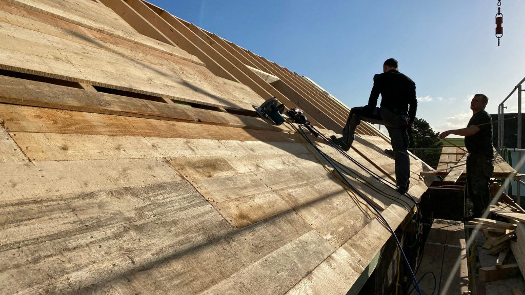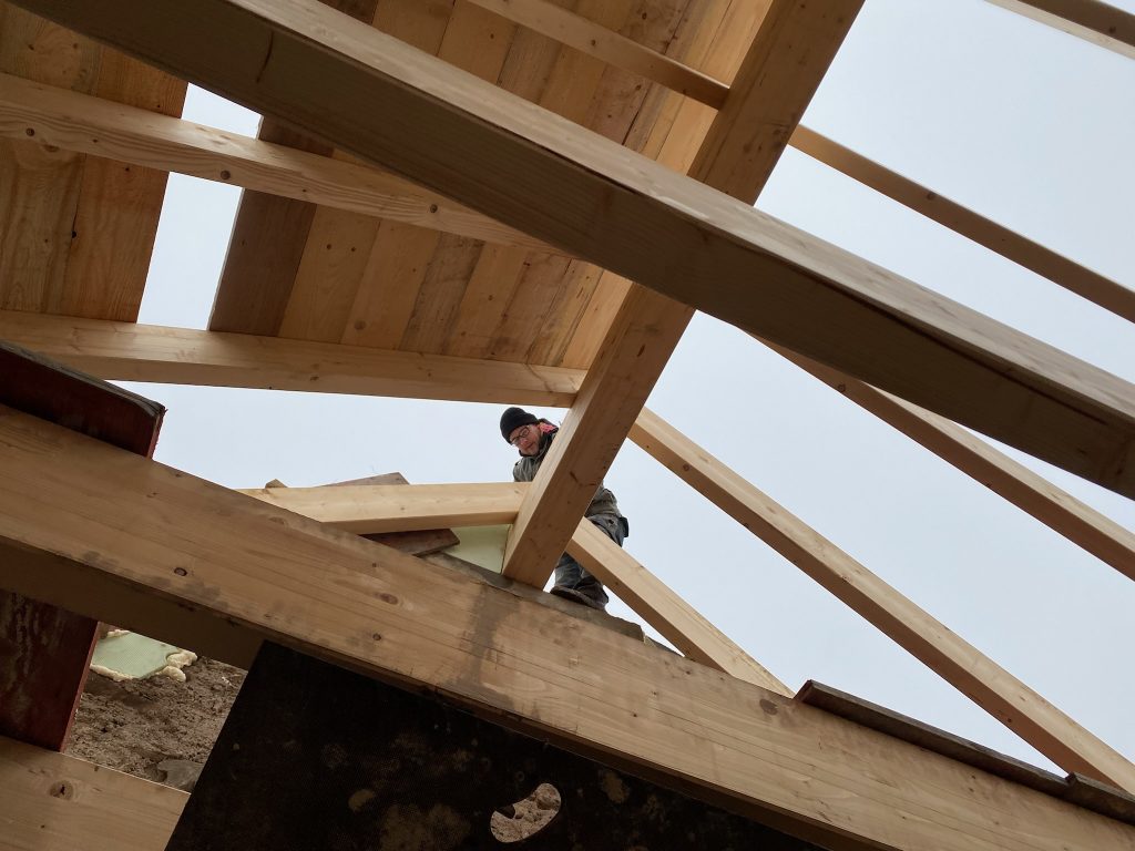 Als Nächstes geht es mit der Dachschalung weiter. Bald ist der Bau dicht und alles kann in Ruhe trocknen.