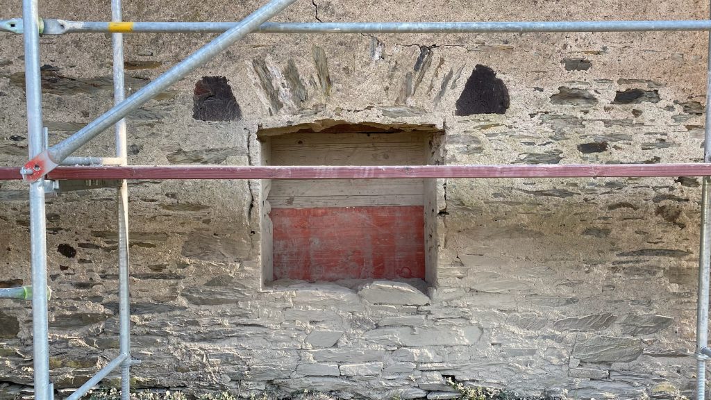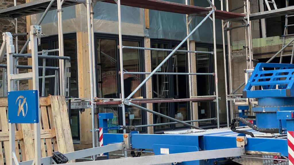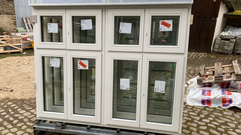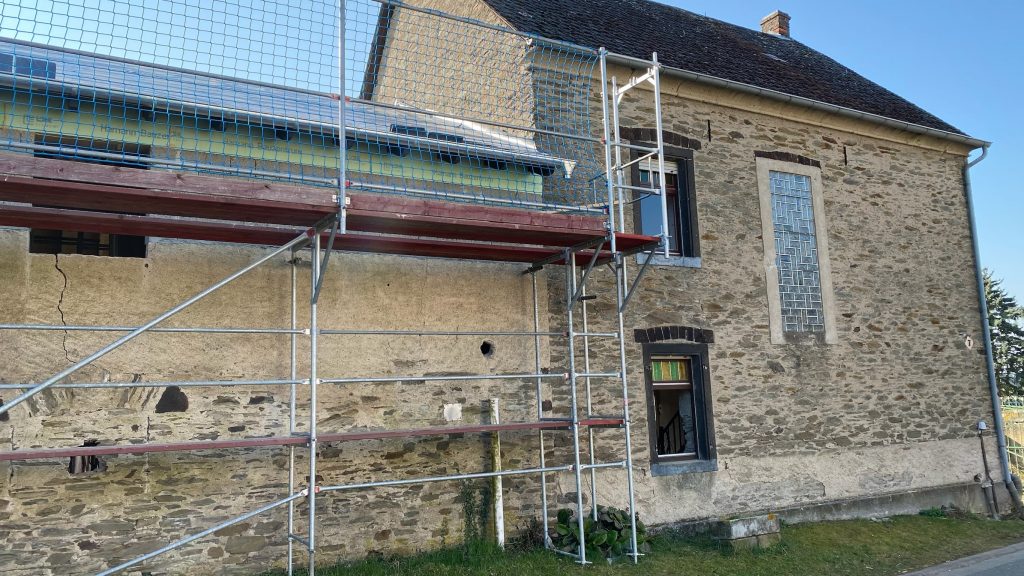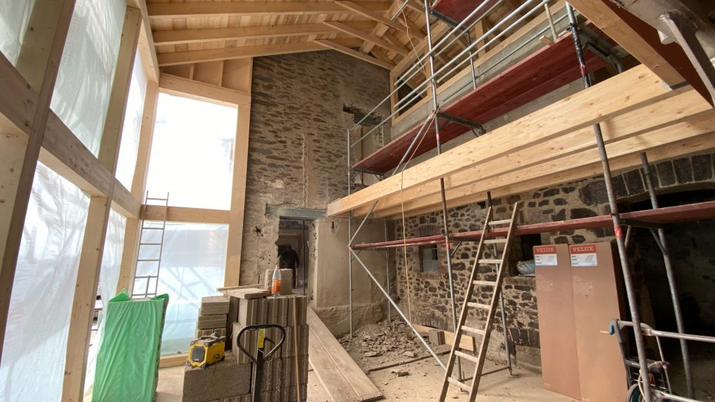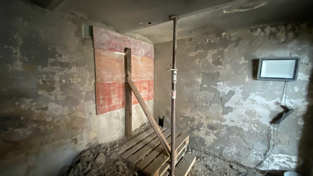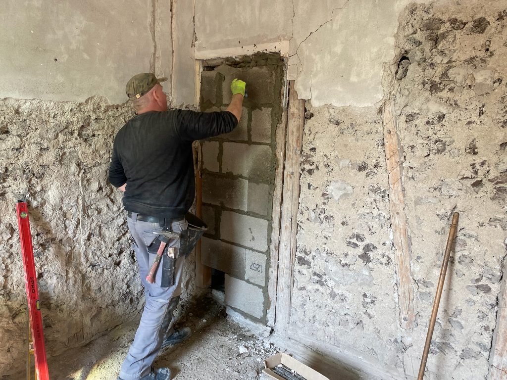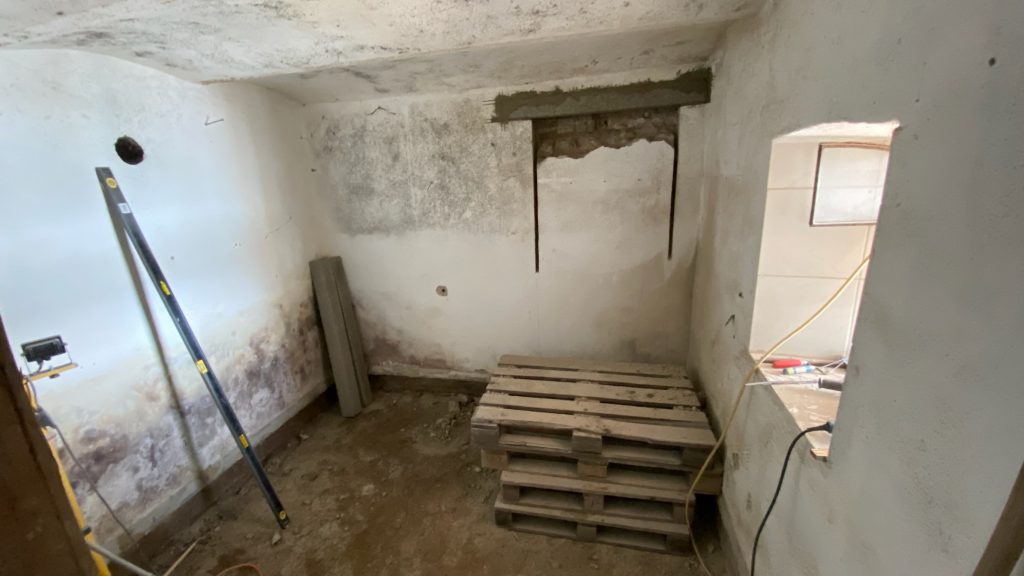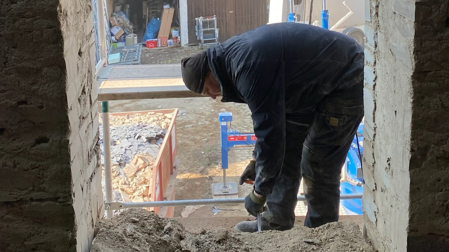 Klasse… genau den, haben wir im jetzigen Flur und der muss raus. Mit der großen Festigkeit haben unsere Maurer Bekanntschaft gemacht und es geht nur sehr mühsam und langsam voran. Stück für Stück knabbern sie sich durch den Schutt. Trotz schwerem Abbruchhammer eine körperliche Herausforderung.