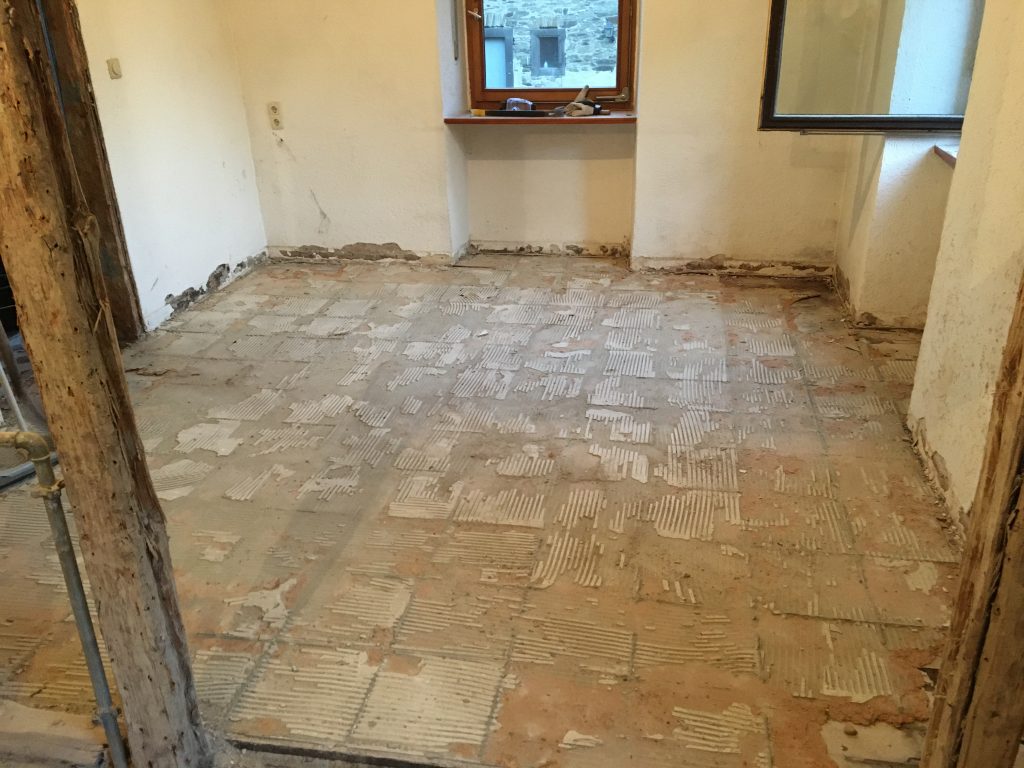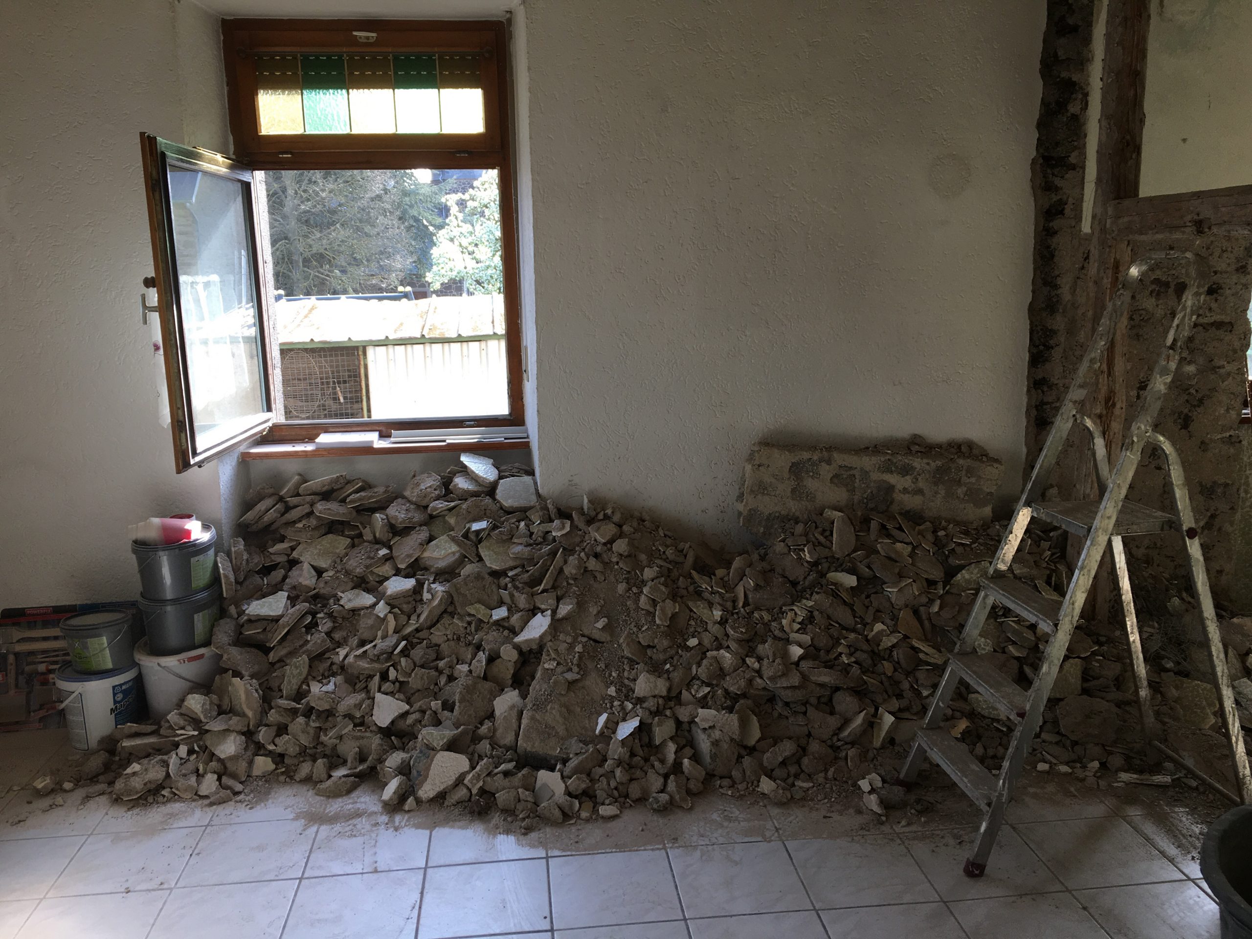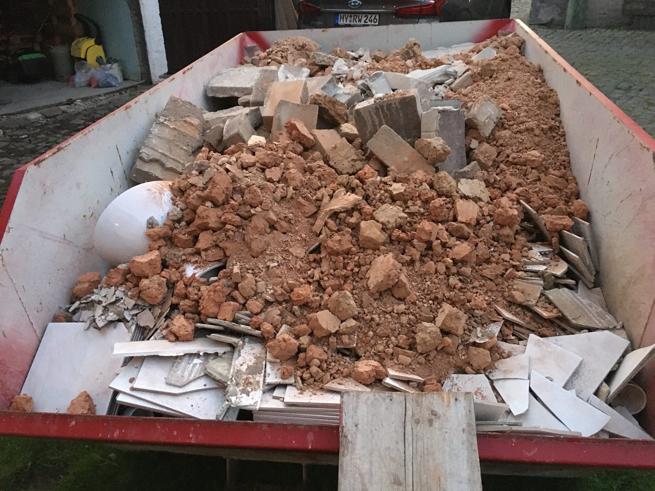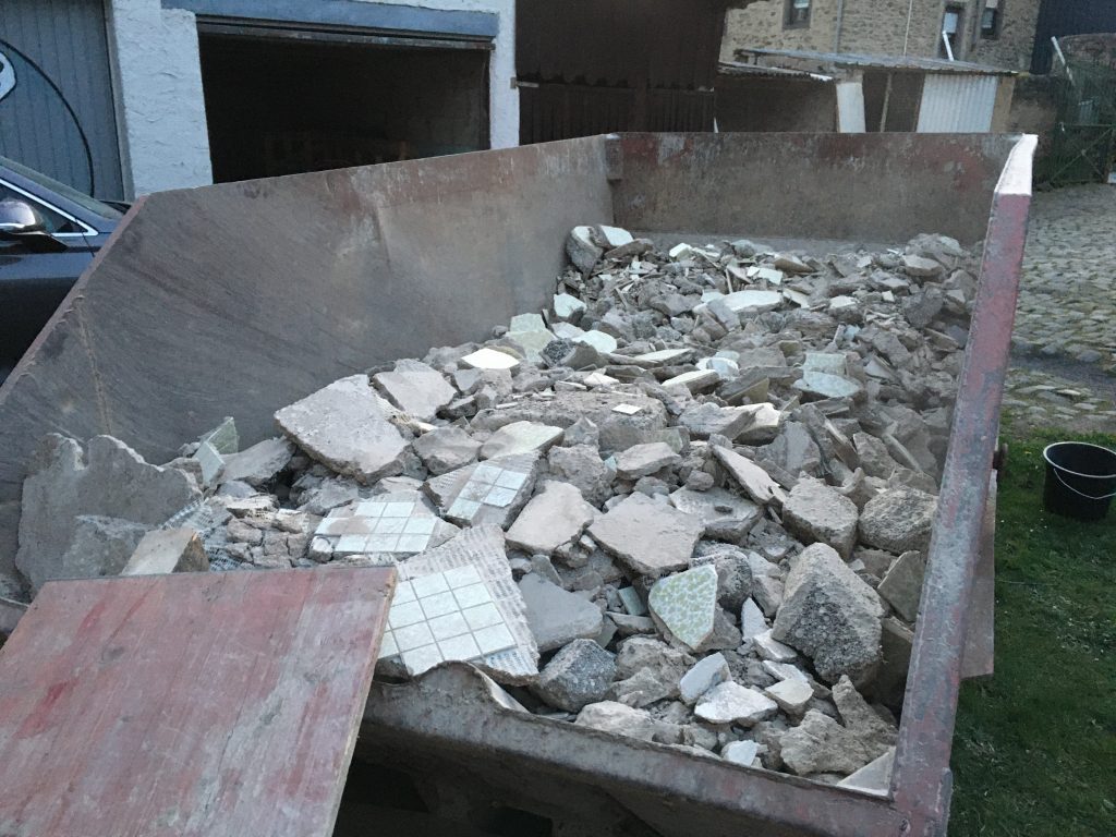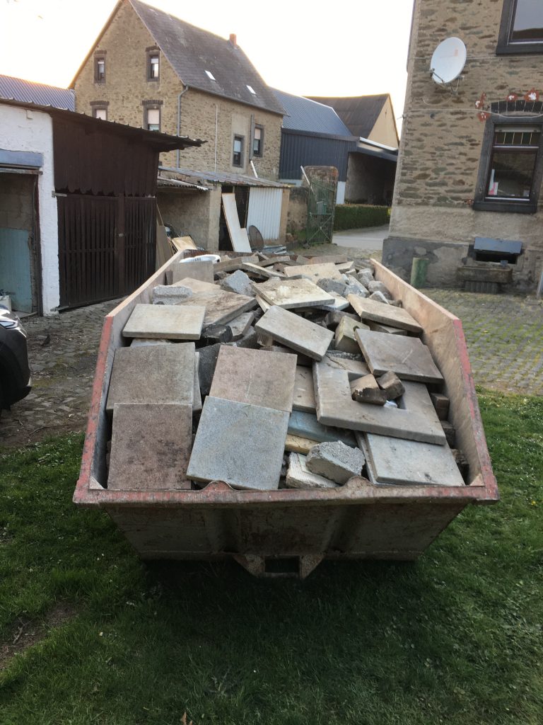 Ich trage den Schutt zusammen und fege ihn in eine Ecke, denn meine Kumpels liegen voll und faul in der Ecke am Backes und der Container ist ja bereits weg. Mist! Wieder kommt ein Haufen des Grauens zustande. Na ja… mein Fitnesslevel steigt damit ein wenig.