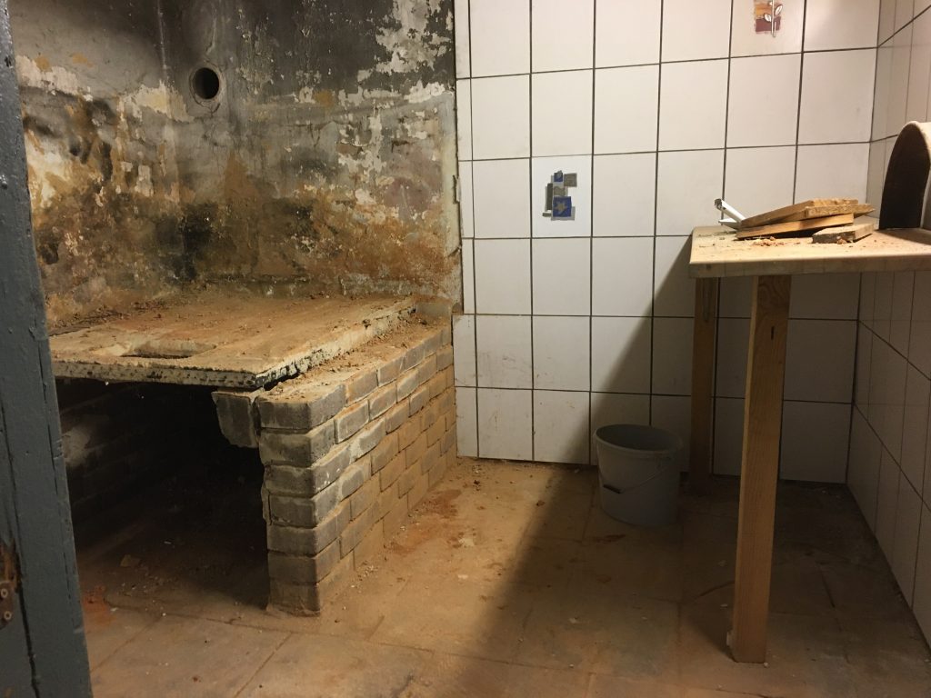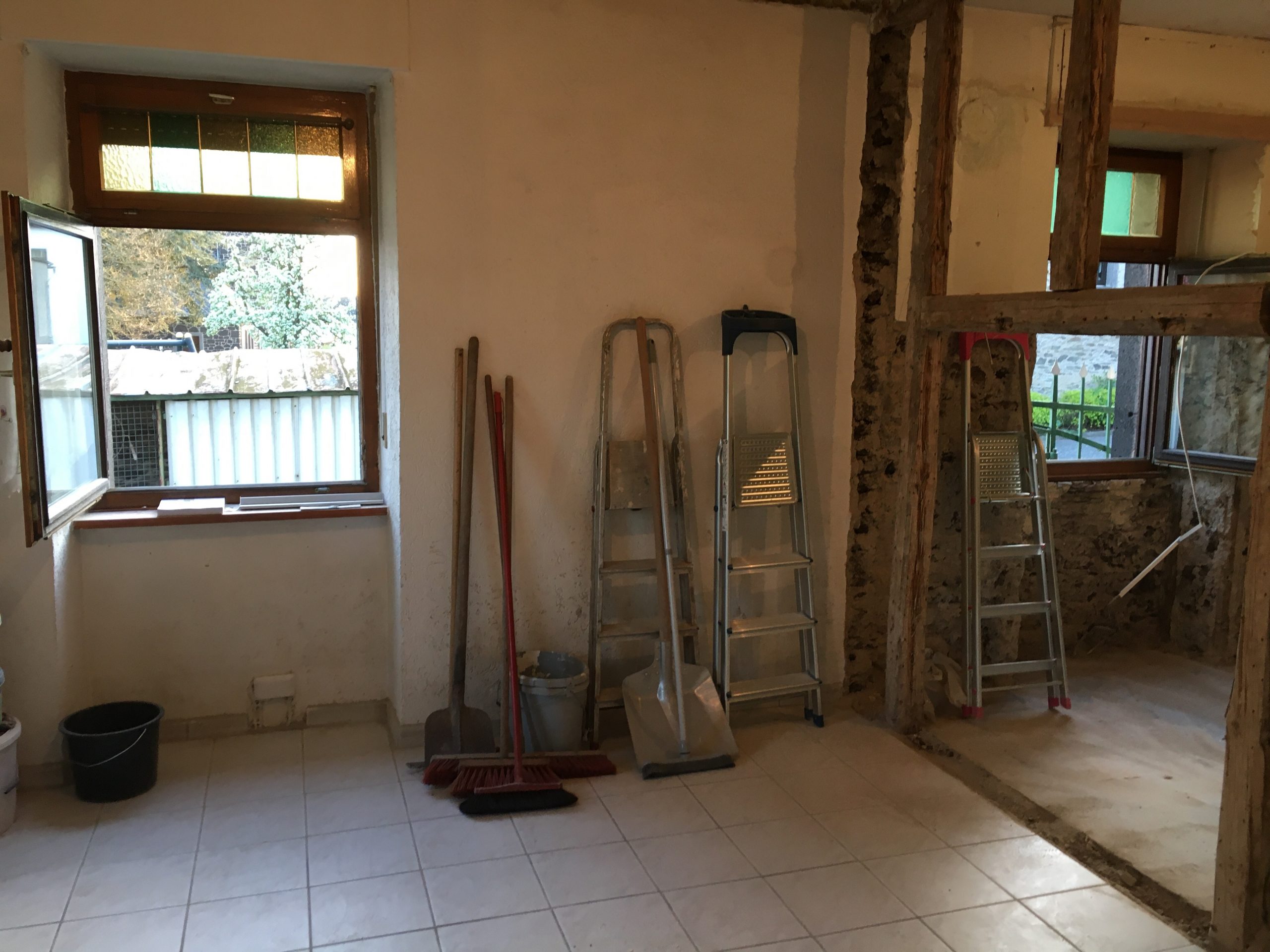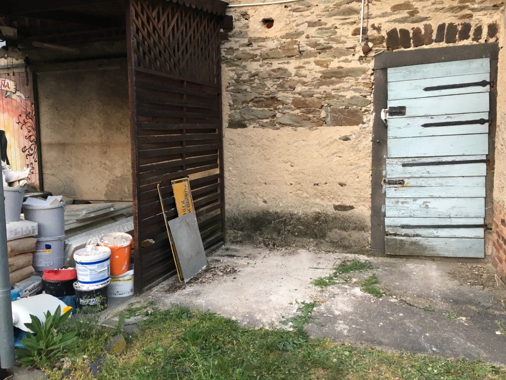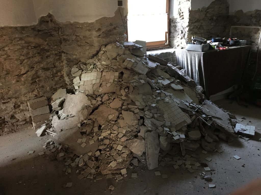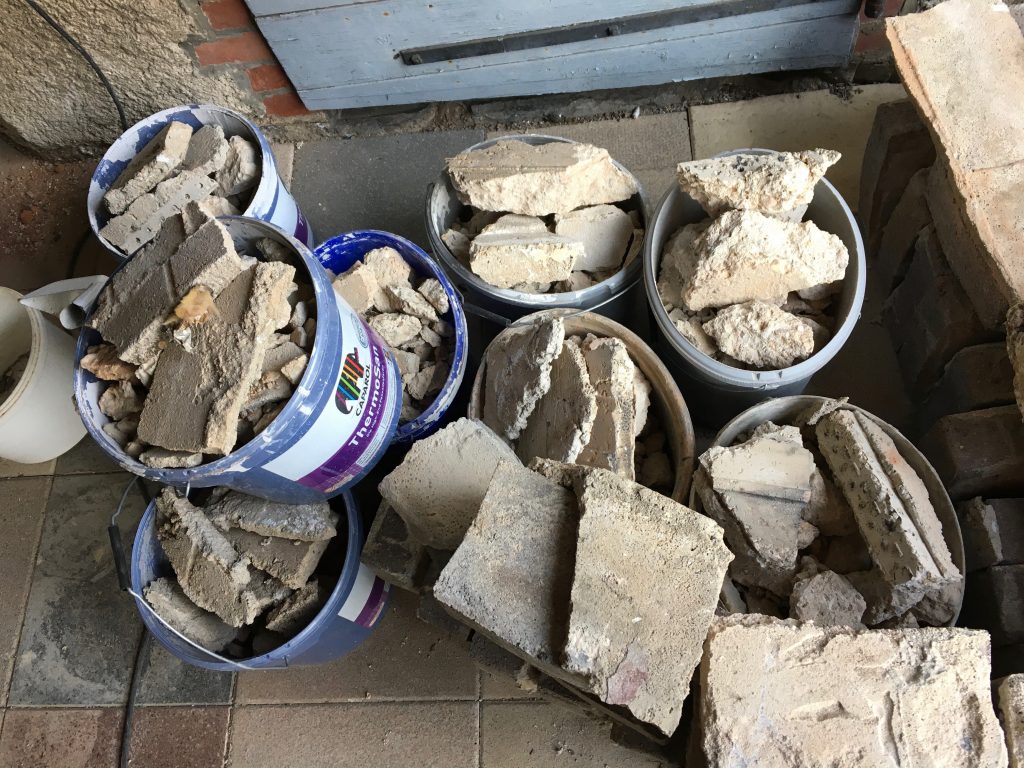 Ich trage den Schutt zusammen und fege ihn in eine Ecke, denn meine Kumpels liegen voll und faul in der Ecke am Backes und der Container ist ja bereits weg. Mist! Wieder kommt ein Haufen des Grauens zustande. Na ja… mein Fitnesslevel steigt damit ein wenig.