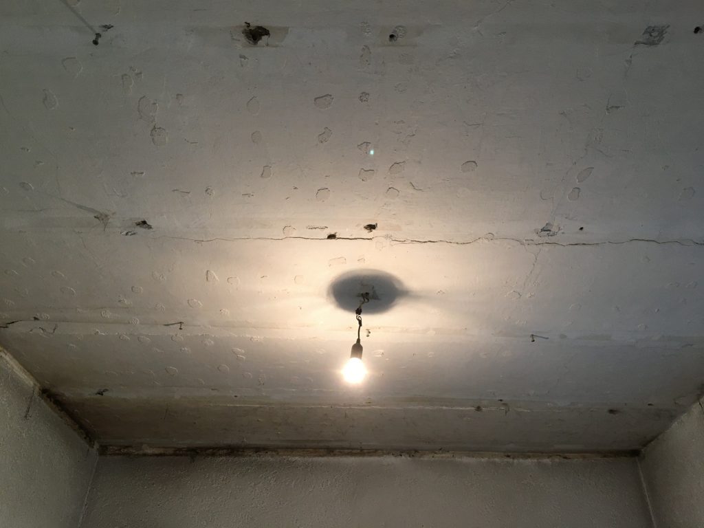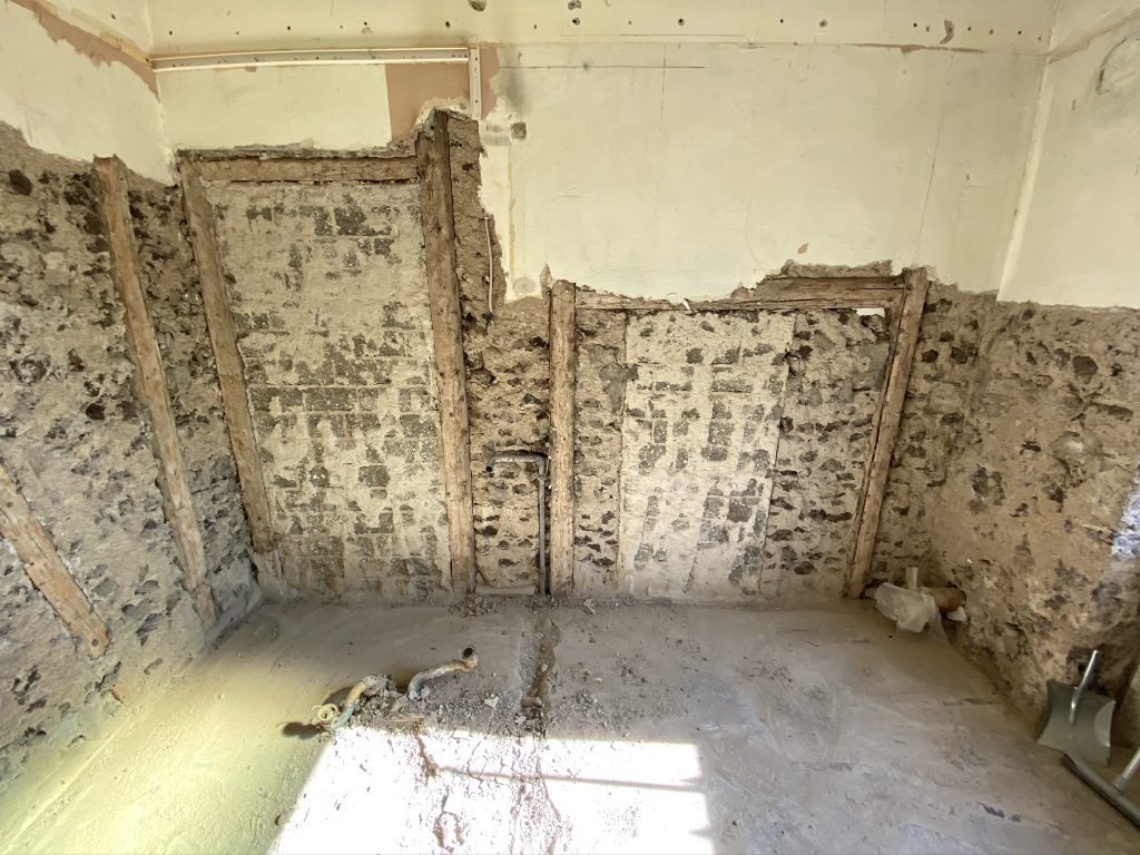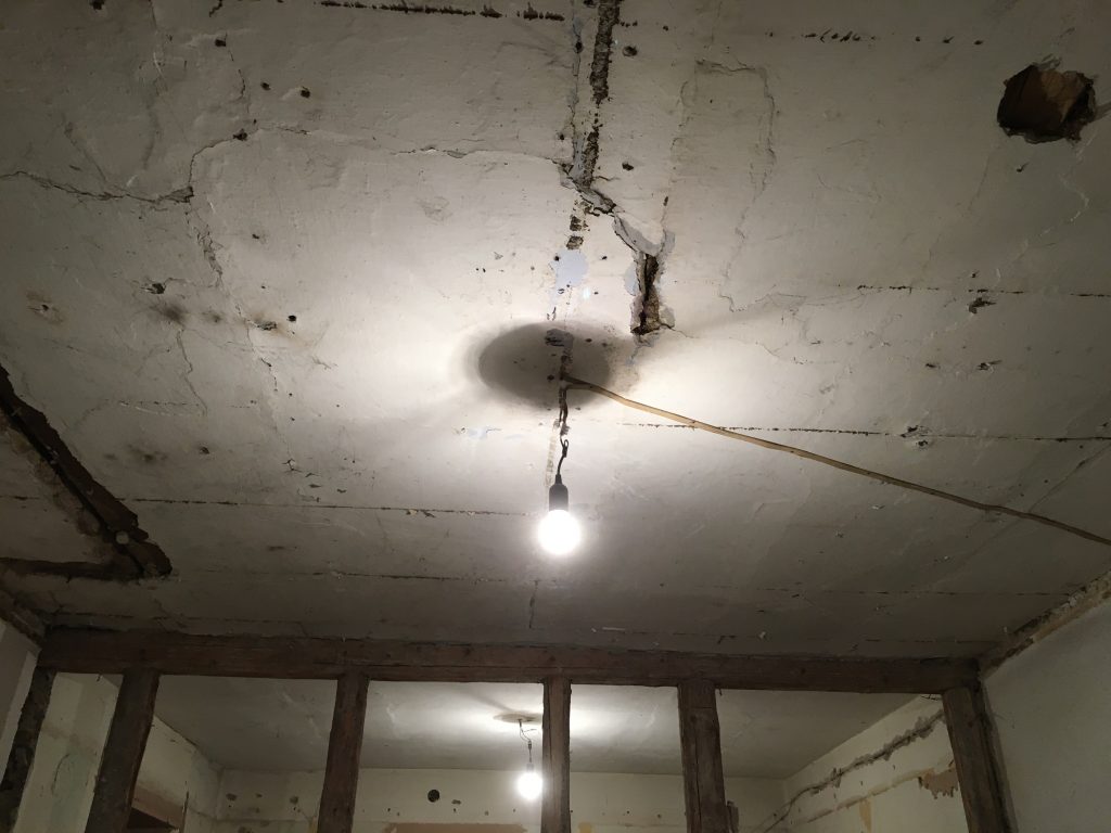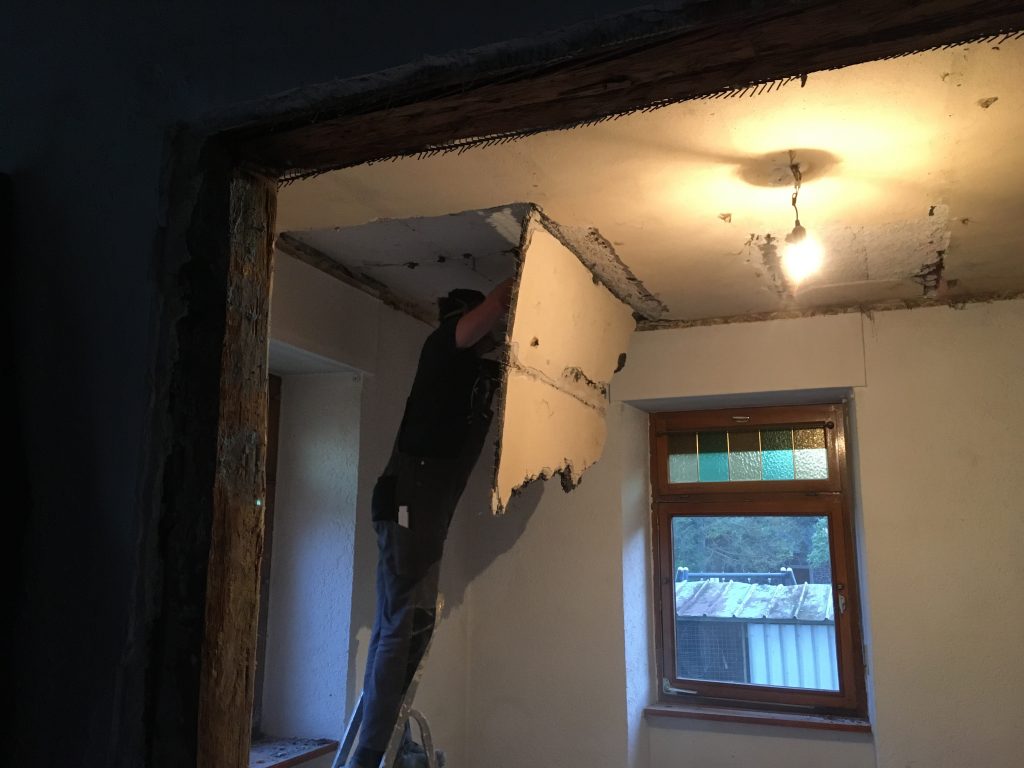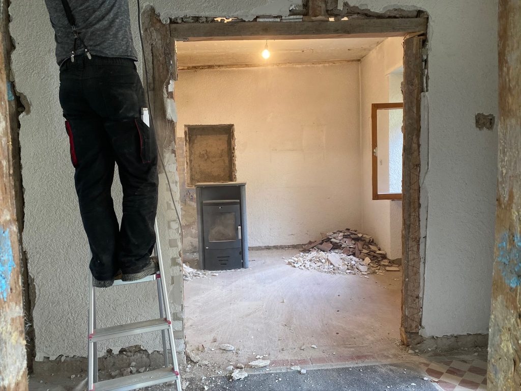 Weiter gehts mit den schönen Klinkern am Durchgang und hinter dem Kamin. Auch sie lassen sich mit dem reparierten Abbruchhammer wunderbar schnell entfernen. Nicht nur die Klinker fallen, sondern auch der Putz darunter. Wir wollen sehen, wie die Balken verlaufen und ob es sich lohnt diese zu erhalten oder auch teilweise stehen zu lassen. Ich stelle mir das schon toll vor, wenn im zukünftigen großen Flur noch etwas von dem ursprünglichen Flair erhalten bleibt.
