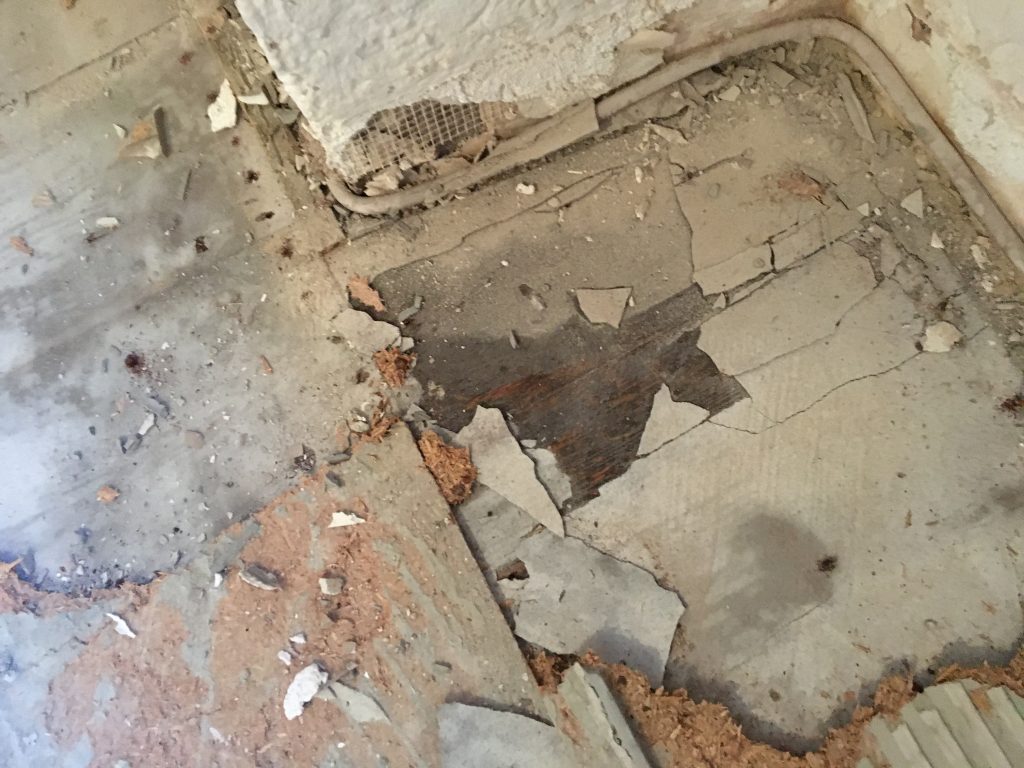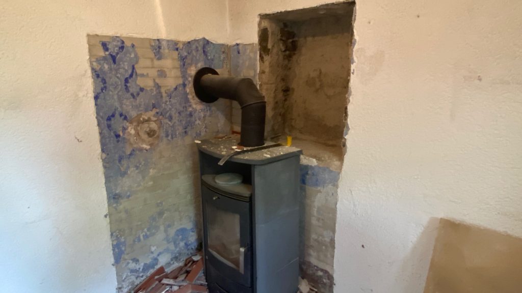 Na, fällt es euch auf?? Da hinter dem Kamin? Richtig! Da war wohl mal ein Fenster zum Hof. Sollten wir es wieder öffnen, dann kann man dort in unser Esszimmer schauen. Wieder eine Überlegung, die wir auf unsere ToDo Liste setzen. Unter den Verblendern kommt auch die alte Wandbemalung zum Vorschein. Die ist, wie so ziemlich im ganzen Haus, in blau gehalten. Ich würde mein Haus so gerne im Originalzustand sehen, doch Zeitreisen kann man leider nicht buchen.